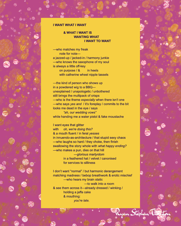 Ryan Stephen Thornton is a bisexual, maximalist poet, performance-maker, and PhD researcher in Theatre & Performance at York St John University. His writing blends comedy, queerness, absurdism, and the poetics of everyday noticing into maximalist sprawl. He is the author of Salt-Rimmed Breath on Jazz-Thigh Gospel (2025) and the creator of Poet Chaotique, a Substack devoted to mischief, language, and excess. Find more of his work at Poet Chaotique.